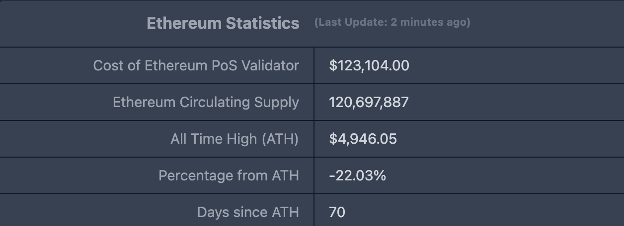 ETHUSD :现价$3,850.54,历史最高价$4,878.26,距最高价跌幅约22.03%