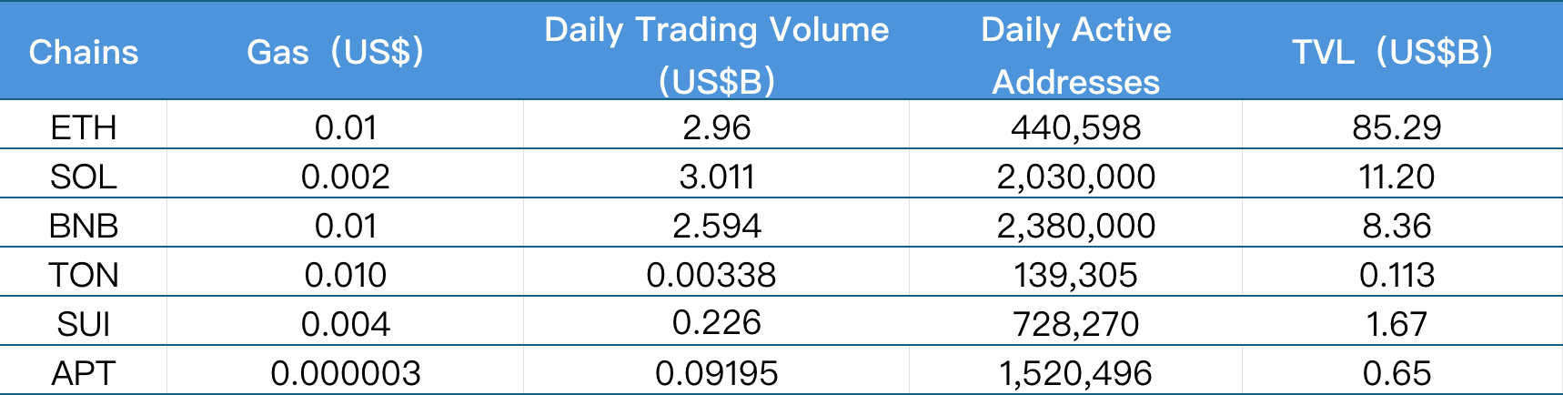 主要从日交易量、日活跃地址、交易费用分析目前主要Layer1含ETH、SOL、BNB、TON、SUI以及APTOS的相关数据。