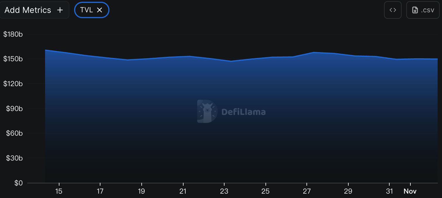 据DeFiLlama的数据,本周DeFi总TVL为$1,496亿,较上周1,575亿,下降约5.01%。
