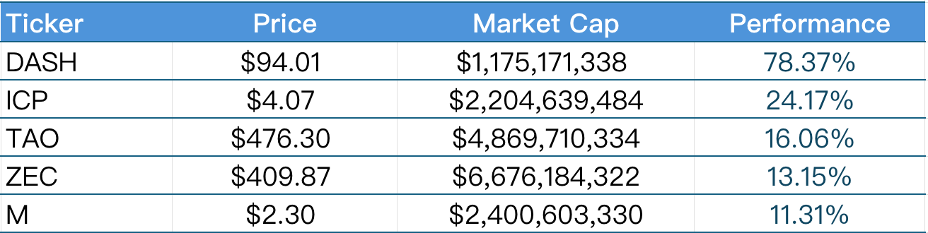 - 本周公链整体活跃度略有回落。Ton 成为少数亮点,日成交量增长 11.24%、活跃地址上涨 29.08%;而 Sui 表现最弱,成交量下滑 50.44%、TVL 下降 22.23%。Ethereum、BNB Chain、Solana、Aptos 在日成交量上均出现不同程度下跌,其中 BNB Chain 跌幅最小(-1.39%)。在交易费用上,各链波动不大,Aptos 反弹 13.71%,而 Solana 和 Sui 分别下降 20.23% 与 11.11%。整体来看,资金和活跃度呈现阶段性回调。
