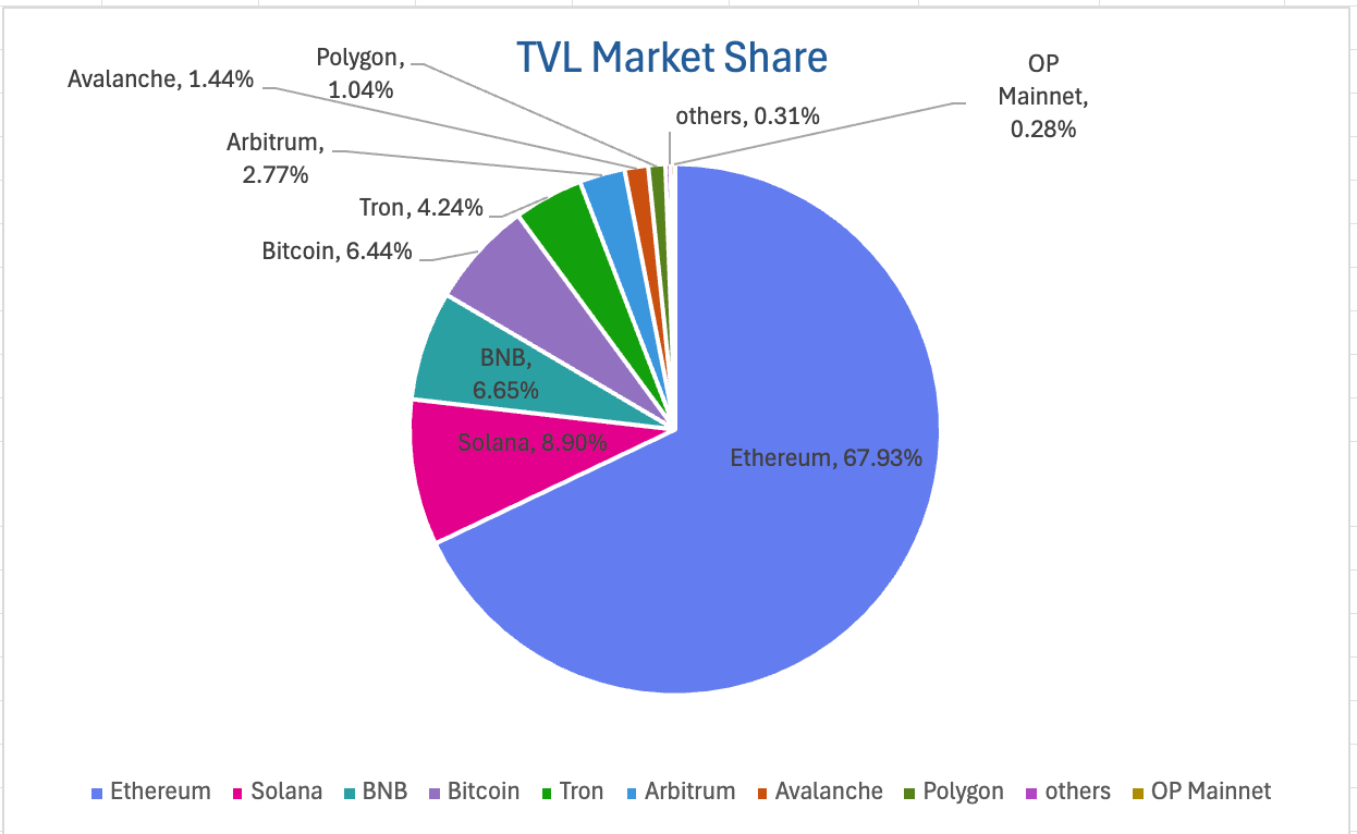 按公链进行划分,其中TVL最高的三条公链分别是Ethereum链,占比67.93%;Solana链,占比8.9%;BNB Chain,占比6.65%。