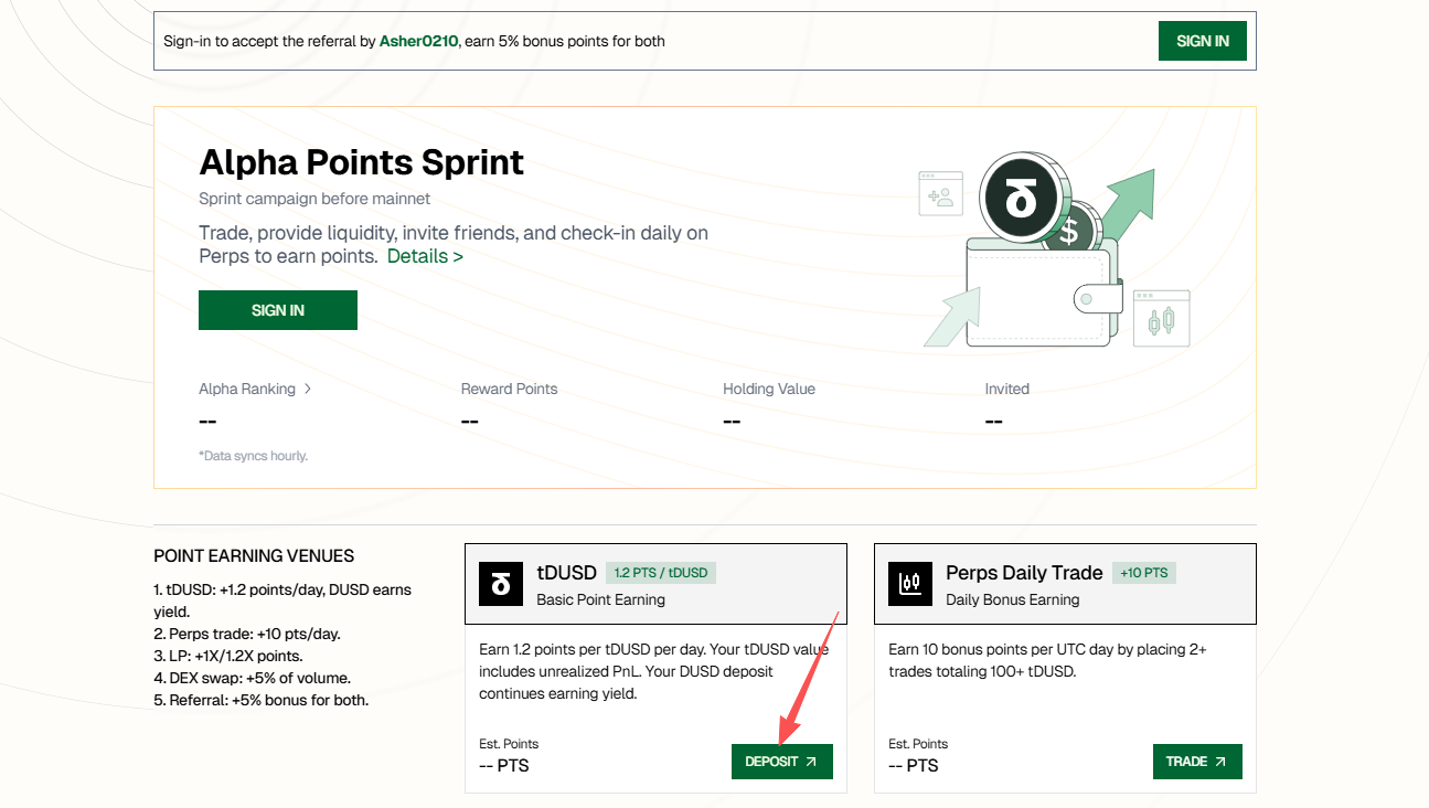 目前,“无交易损耗”的预存款稳定币活动已结束,用户可以将稳定币 DUSD 存入 StandX Alpha 平台兑换成 tDUSD 赚取每日积分。