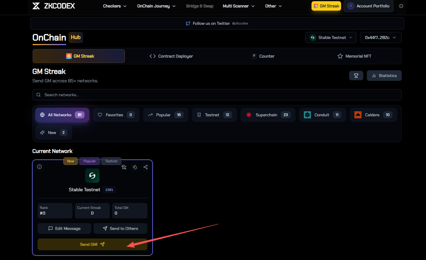 STEP 3. 在 ZKCODEX 平台中选择 Stable 测试网发送 GM(链接:https://zkcodex.com/onchain/gm),连接钱包后找到 StableTestnet,点击 Send GM,弹出钱包确认即可。
