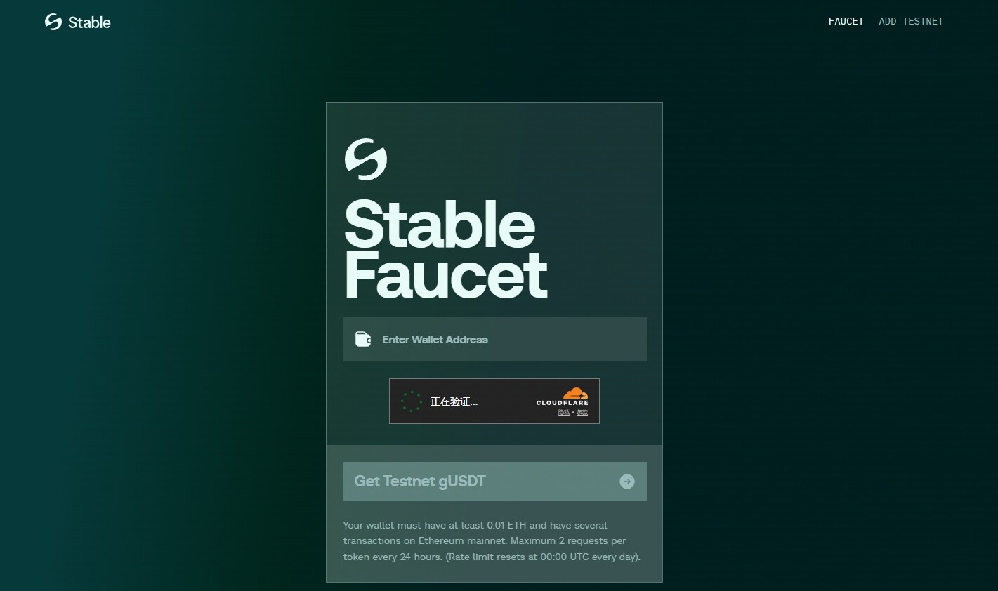 STEP 1. 输入钱包地址,领取测试代币(链接:https://faucet.stable.xyz/faucet)。