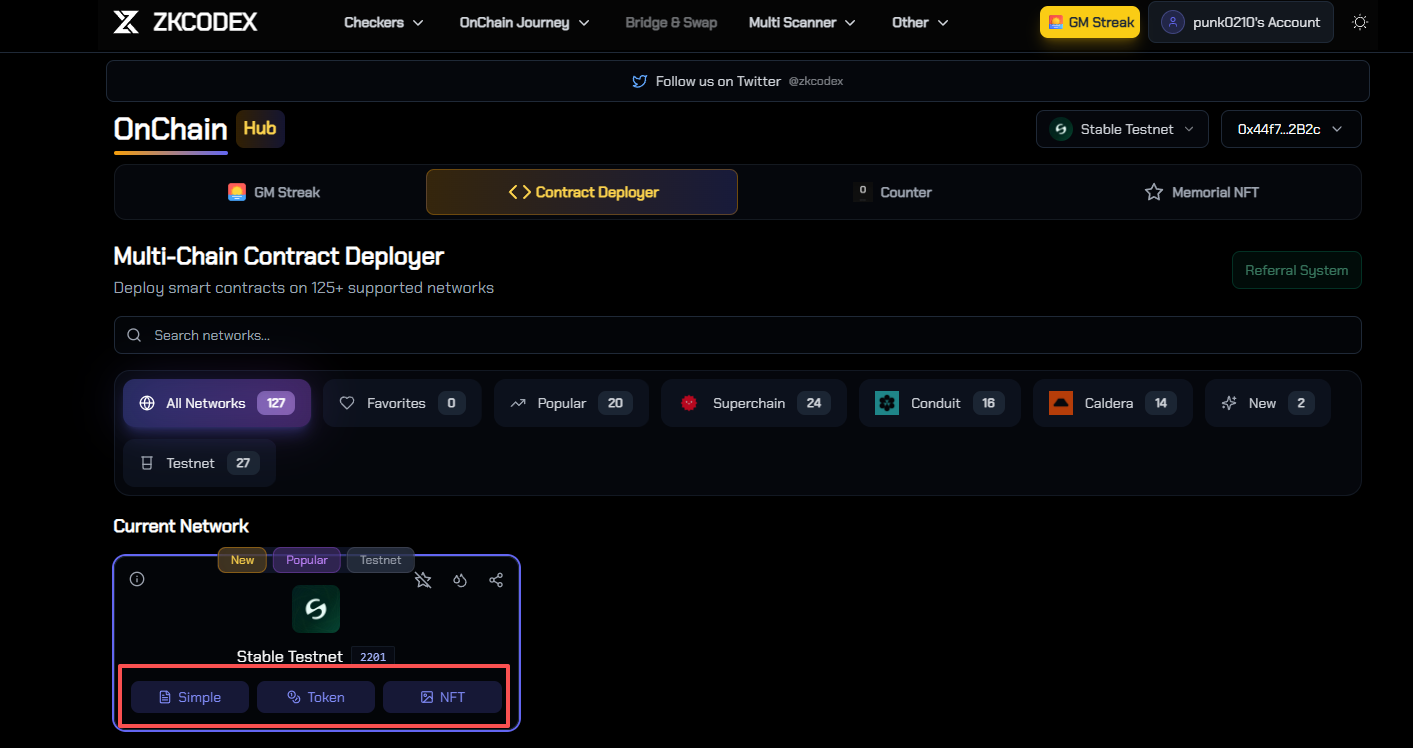 STEP 4. 在 ZKCODEX 平台中选择 Stable 测试网(链接:https://zkcodex.com/onchain/deploy),连接钱包后找到 Stable Testnet,分别点击简单部署、代币部署、NFT 部署,弹出钱包确认即可。