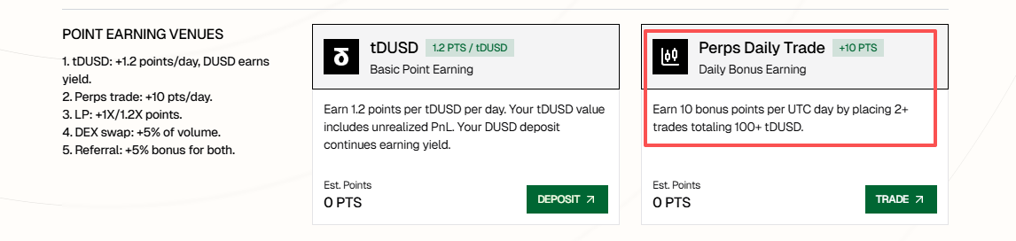 STEP 2. 使用兑换的 tDUSD 在 StandX Alpha 平台参与合约交易,每日交易超过 100 tDUSD(通过 2 笔以上交易实现)即可获得 10 点积分。