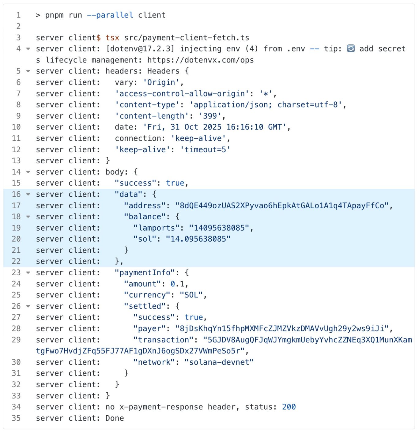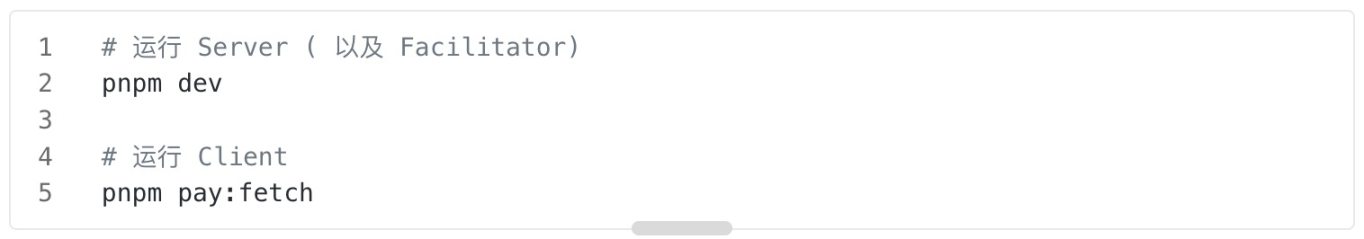 充当客户端角色,对服务器发起请求,对应流程图中 1 ~ 4。其中使用了「 x402-fetch 」提供的帮助函数,自动处理 402 状态、使用客户端钱包的私钥生成签名并重新发送等;