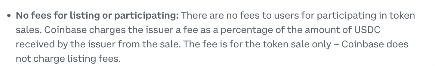 此外,关于一直以来引发市场讨论和关注的“上币费”问题,文档里也给出了对应说明:“代币上线或参与不收取任何费用: 用户参与代币销售不收取任何费用;Coinbase (仅)向发行人收取费用,占发行人从销售中收到的 USDC 金额的一定百分比。该费用仅用于代币销售——Coinbase 不收取上币费。