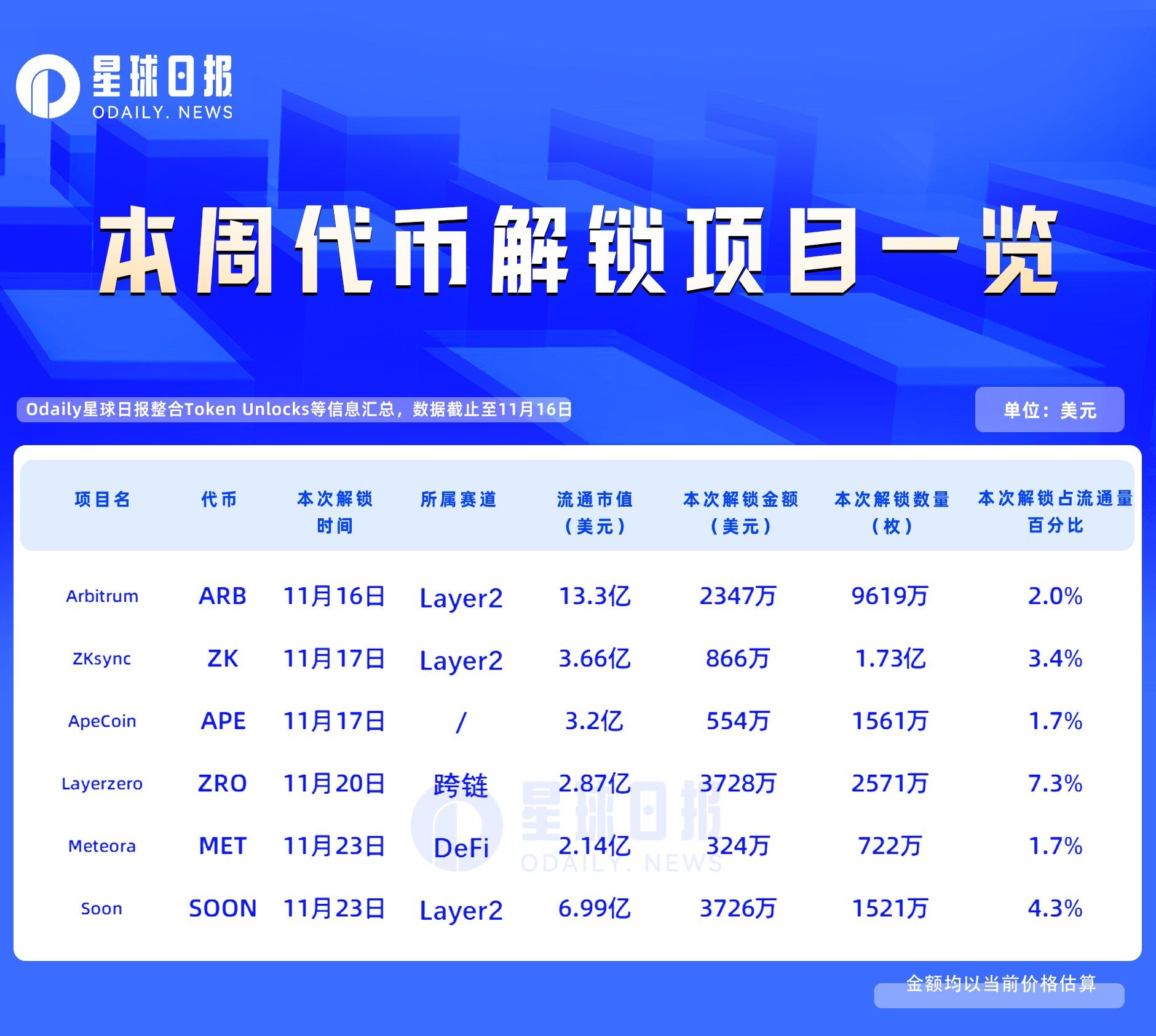 一周代币解锁:ZRO解锁达流通量7.3%代币