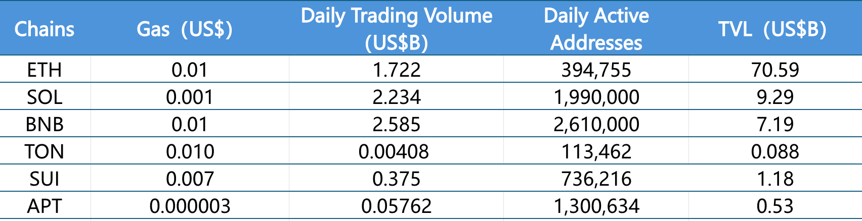 主要从日交易量、日活跃地址、交易费用分析目前主要Layer1含ETH、SOL、BNB、TON、SUI以及APTOS的相关数据。
