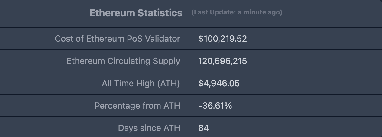 ETHUSD :现价$3,130.35,历史最高价$4,878.26,距最高价跌幅约36.61%