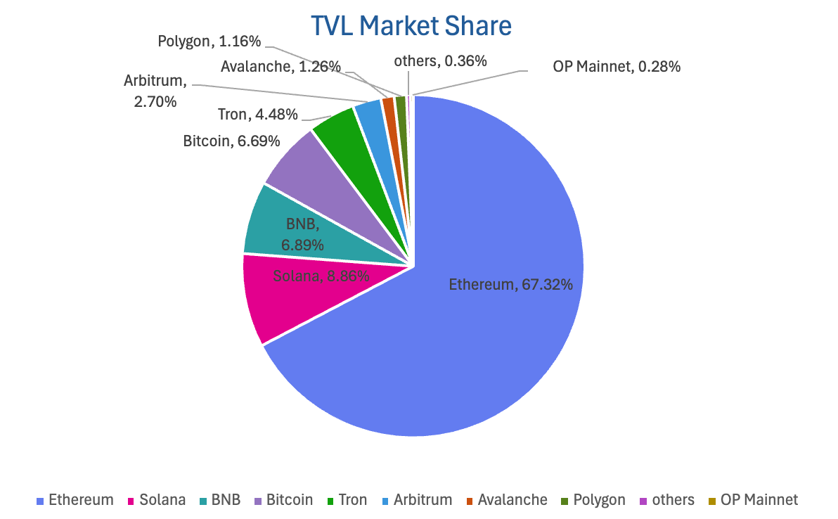 按公链进行划分,其中TVL最高的三条公链分别是Ethereum链,占比67.32%;Solana链,占比8.86%;BNB Chain,占比6.89%。