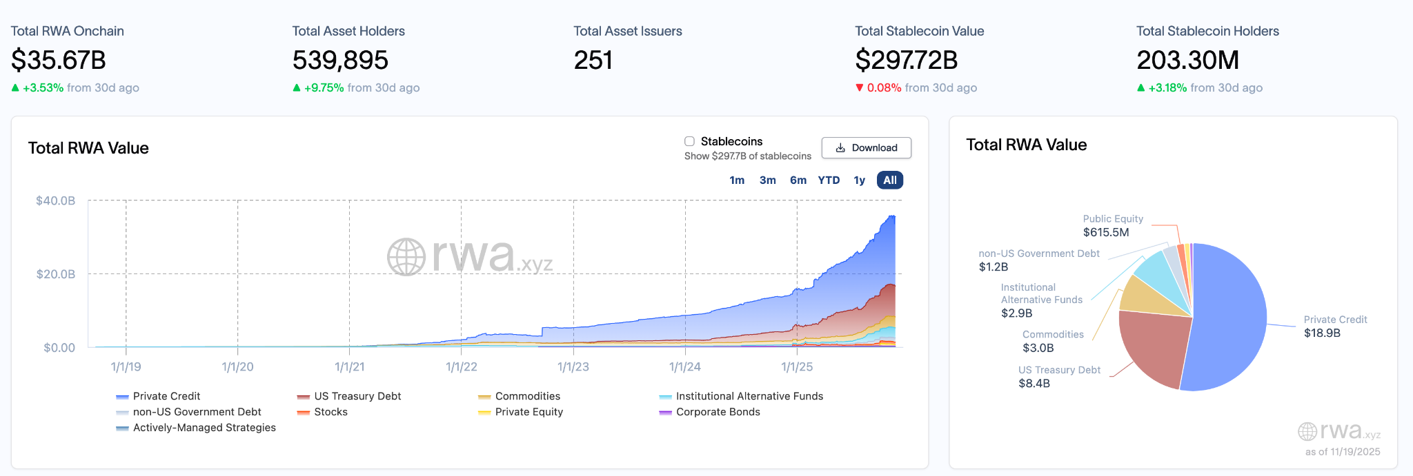 RWA周报|资产中非美政府债务上涨20%;美财长贝森特:稳定币规模到2030年可能增长至3万亿美元(11.12-11.19)