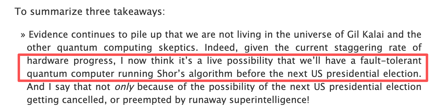 首先是在 11 月 13 日,量子计算领域的大神、得克萨斯大学量子信息中心主任 Scott Aaronson 在其发表的一篇文章中提到:“我现在认为在下一次美国总统大选之前,我们有可能拥有一台能够运行 Shor 算法的容错量子计算机……”