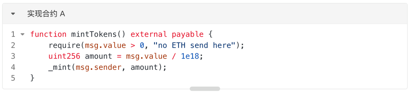 1. 在以太坊 Sepolia 测试网上,项目方(EOA)部署了实现合约,假设该合约的主要功能是用户存入 ETH,来铸造相应的 AToken,大致代码如「mintTokens」函数所示。假设部署的地址为 A。需要注意的是,A 中不存在能直接提取 ETH 的函数。