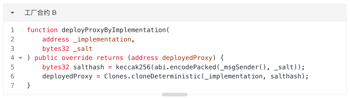 2. 在以太坊 Sepolia 测试网上,项目方(EOA)部署了工厂合约,该合约的功能是根据提供的实现合约地址以及 salt,以最小代理合约(Clones)的方式,部署指向实现合约的代理合约(如函数「deployProxyByImplementation」所示)。假设部署的地址为 B。假设此处我们通过调用「deployProxyByImplementation」函数,以实现合约 A 地址作为 _implementation 传入,部署了指向 A 的代理合约,地址为 C。
