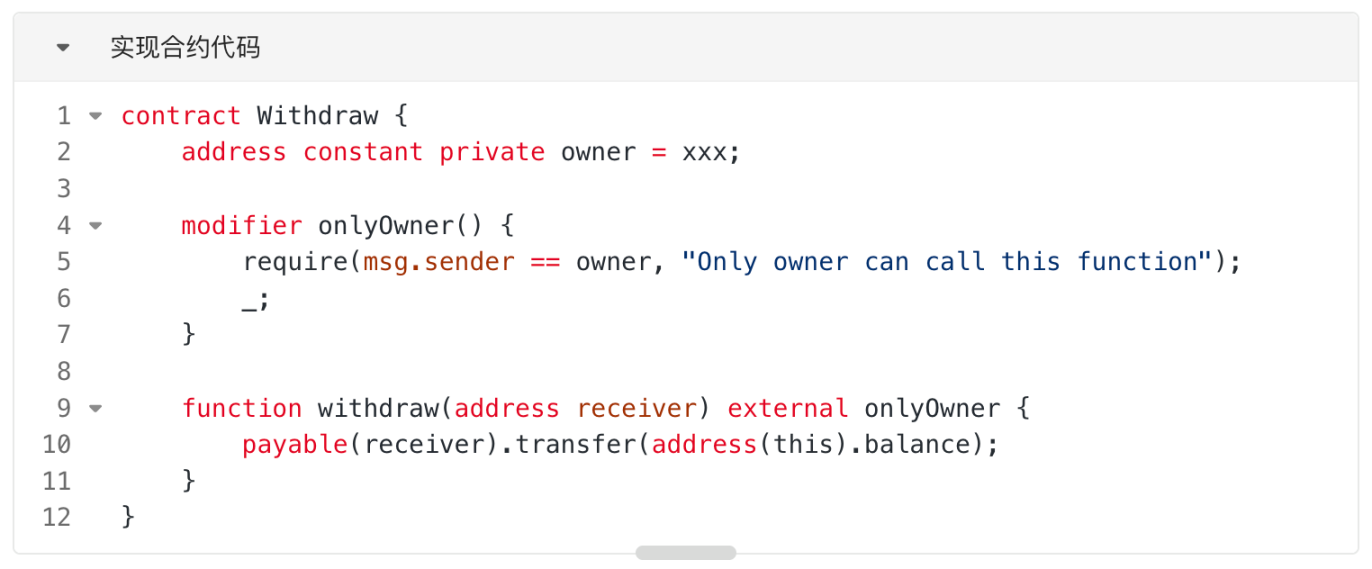 2. 在主网部署与测试网相同地址 A 的实现合约。在#最小代理合约(Clones)#部分提到,通过 Clones 合约的「cloneDeterministic」函数部署代理合约,其计算出的代理合约地址,与入参 salt、实现合约地址有关,与实现合约的字节码无关。因此,我们只需要将一个合约部署在地址 A 上即可,合约的具体内容并不影响代理合约地址的计算。那么我们可以直接在地址 A 上部署一个具备提取 ETH 功能的合约,代码如下所示。