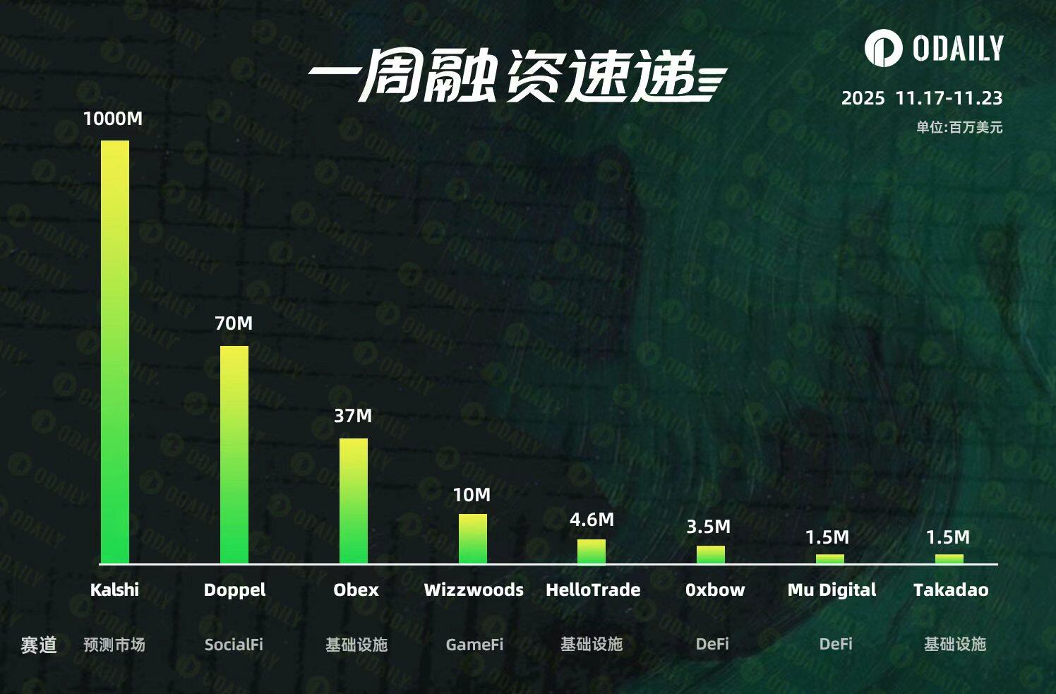 根据 Odaily 星球日报不完全统计,2025 年 11 月 17 日至 11 月 23 日,全球区块链领域共披露 8 起融资事件,较前一周的 7 起略微增加。但是融资总额为 11.28 亿美元,较前一周的 1.065 亿美元大幅增加。