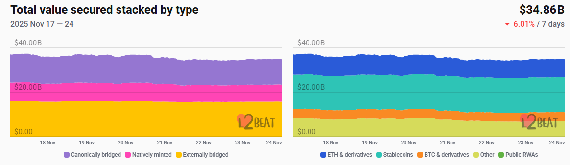 据L2Beat数据显示,以太坊 Layer 2总TVL为348.6亿美元,本周较上周369亿美元,整体跌幅为6.01%。
