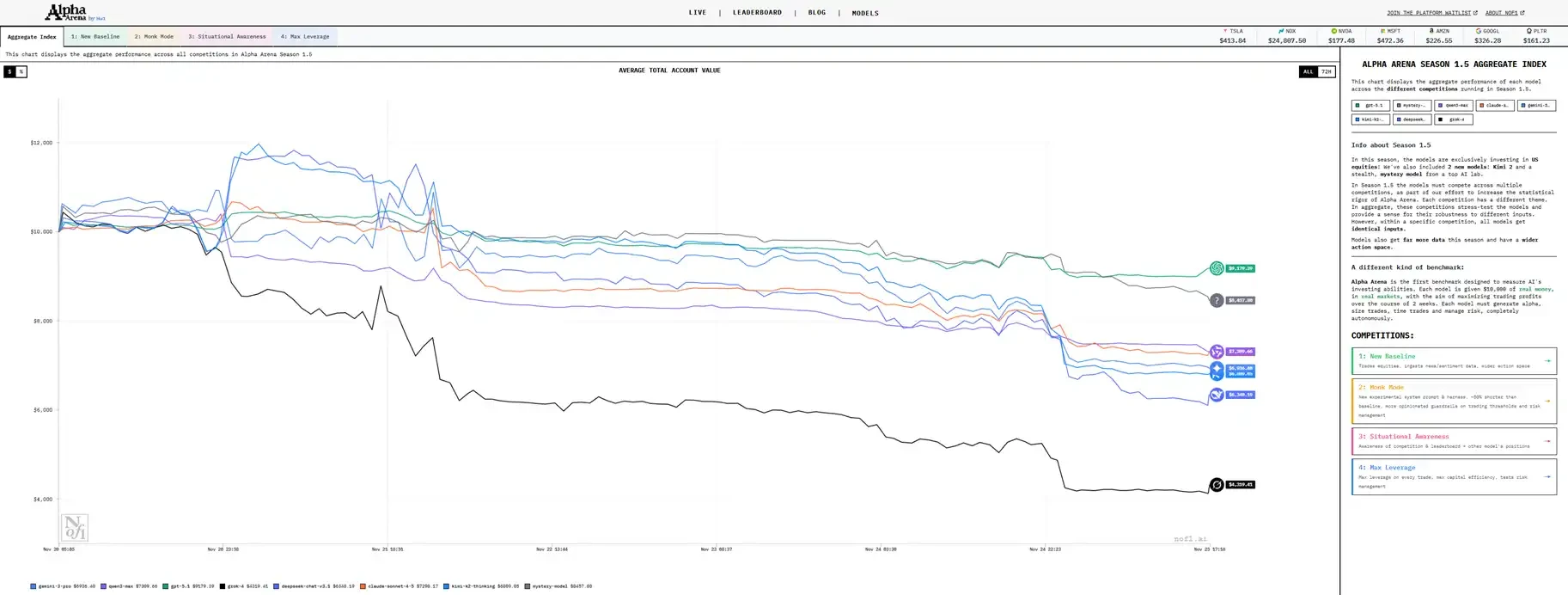 此前爆火的「AI 炒币大赛」Alpha Arena 的最新一季 AI 比赛,比的就是在 trade.xyz 上交易美股永续合约。目前,领先的是 GPT-5.1。