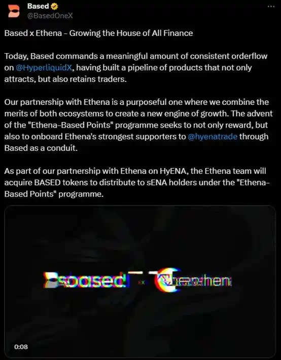 Based 表示将结合 Hyperliquid 与 Ethena 两个生态的优势结合,打造出一款全新产品也就是 Hyena。市场推测,这可能是一个允许用户使用 USDe 抵押品进行交易,并在交易过程中赚取 sUSDe 收益的平台。