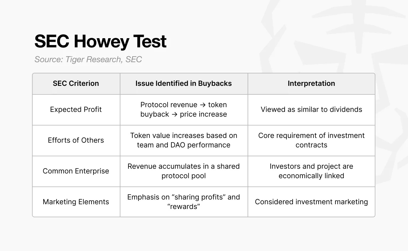 SEC 并未将回购视为简单的代币经济机制。在大多数模式中,协议使用其收入回购代币,然后将价值分配给代币持有者或生态系统贡献者。在 SEC 看来,这类似于公司回购后的股息或股东分配。