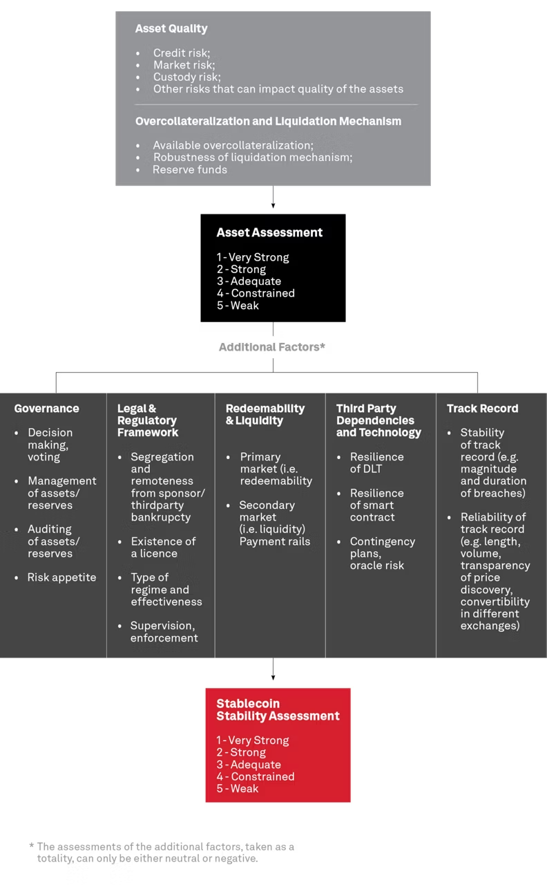 - 在完成资产质量评估后,标普还将考量治理机制、法律与监管框架、赎回能力与流动性、技术及第三方依赖、历史记录等五个额外维度(下图深灰色框);