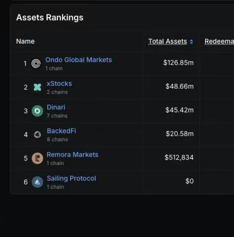9 月 12 日,链上数据显示,代币化股票板块总锁仓量(TVL)中,Ondo Global Markets 以 1.2685 亿美元位列第一,规模已超过其他平台总和。
