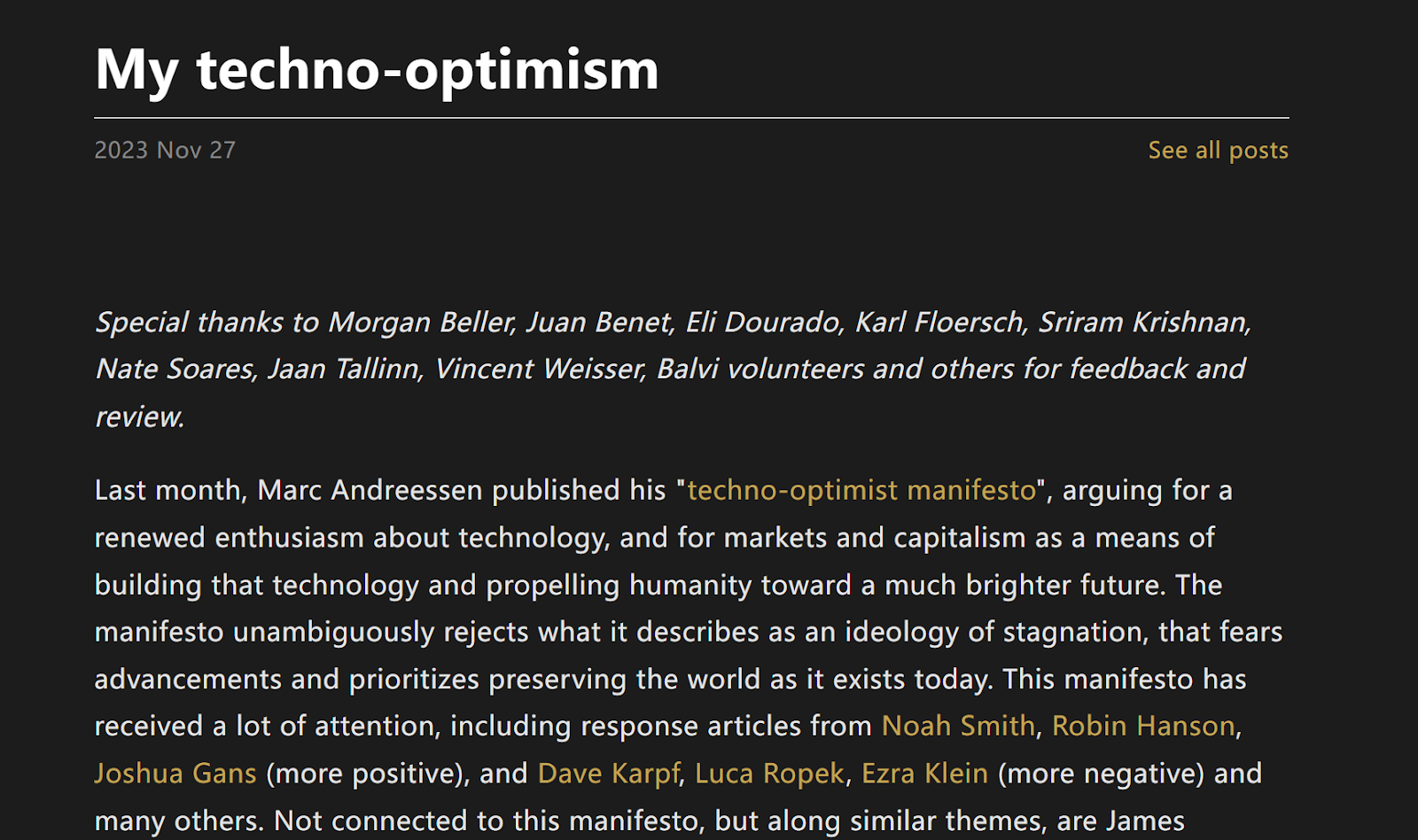 在 2023 年 11 月 27 日,他专门发文《My techno-optimism》(我的技术乐观主义),提出了对技术加速的审慎思考。