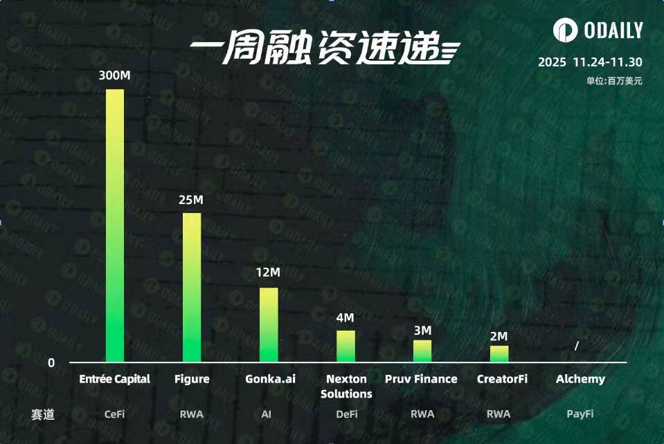 11月25日,加密基金 C1 Fund 投资加密货币支付解决方案提供商 Alchemy,具体金额暂未披露,Alchemy 是目前 Web3 市场中的核心基础设施层,为 Robinhood、Stripe、摩根大通和 Coinbase 提供交易支持,C1 Fund 此前已投资 Chainalysis、Ripple。根据 Odaily 星球日报不完全统计,2025 年 11 月 24 日至 11 月 30 日,全球区块链领域共披露 7 起融资事件,较前一周的 8 起略微减少。但是融资总额为 3.46 亿美元,较前一周的 11.28 亿美元大幅降低。