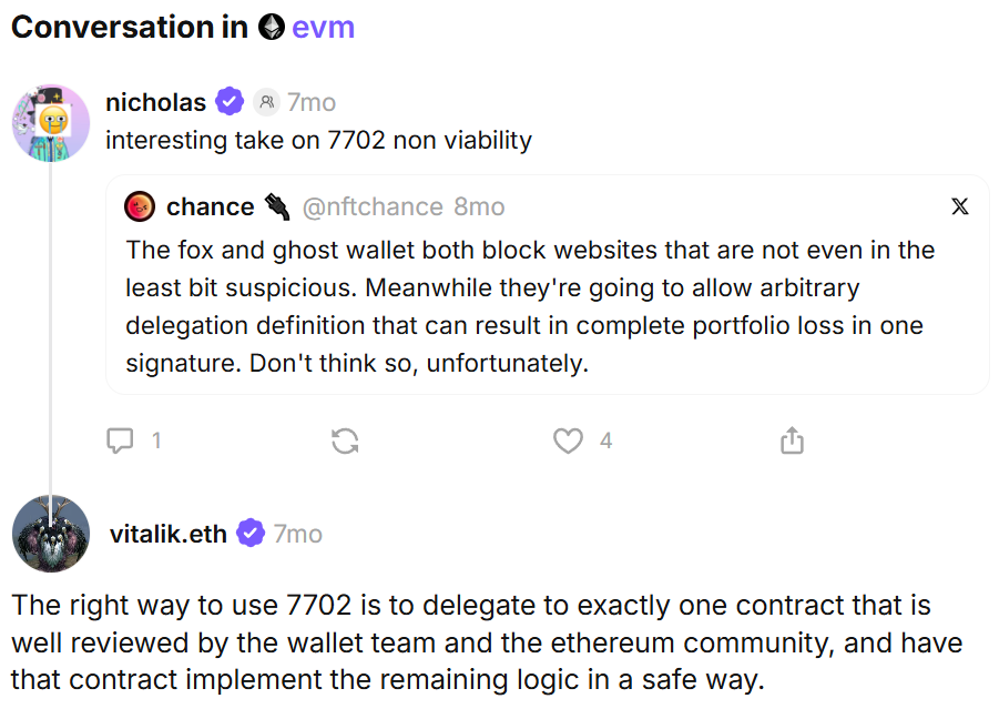 毕竟从 EOA 迁移到 AA 需要用户把资产转移到新地址,这太麻烦了,这就引申出 Vitalik Buterin 此前提出的 EIP-7702 提案,它巧妙地解决了此前三个提案(EIP-4337、EIP-3074、EIP-5003)争论不休的兼容性难题,做了一件神奇的事:允许现有的 EOA 账户在交易期间,「临时变身」为智能合约账户。