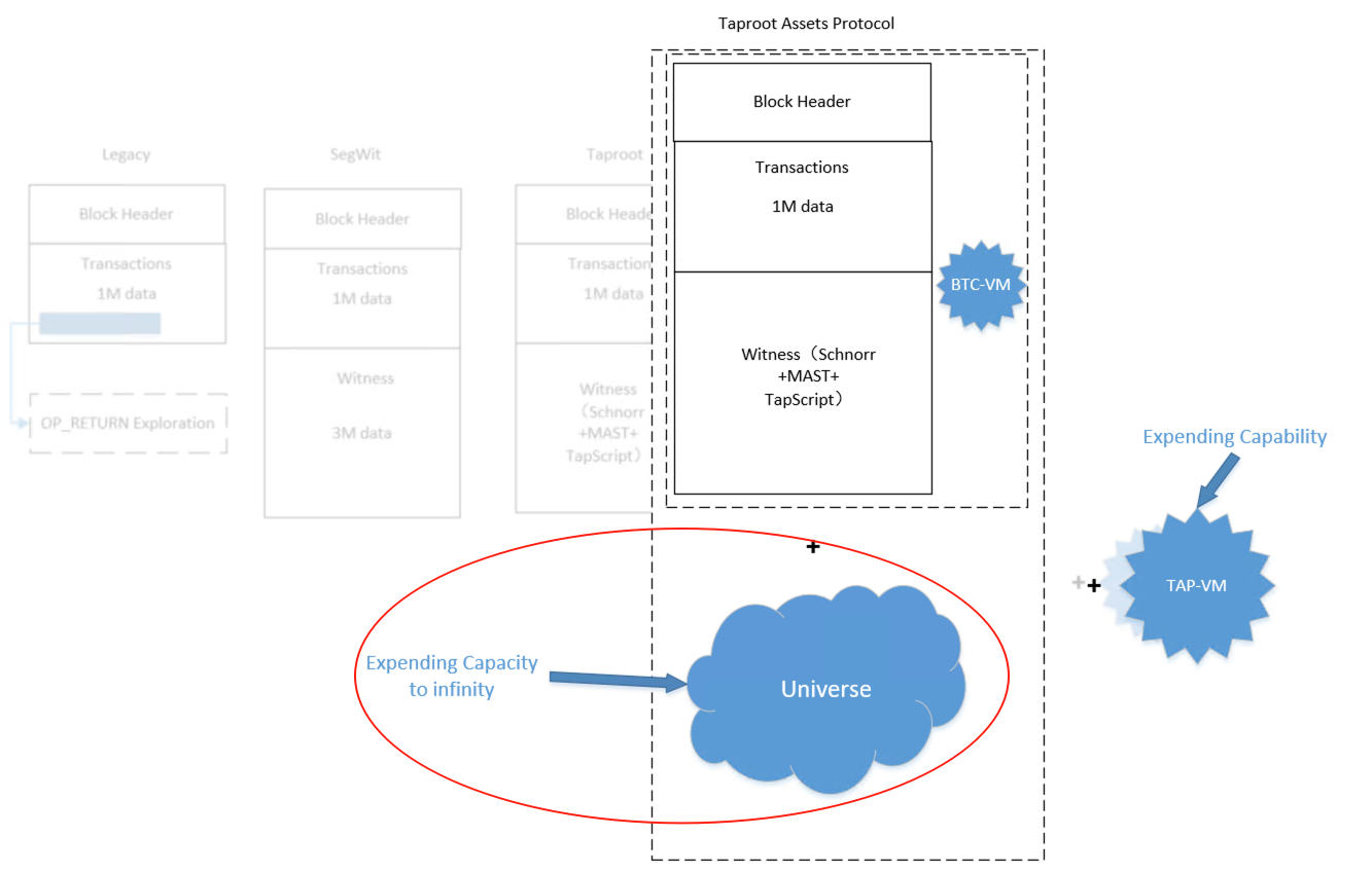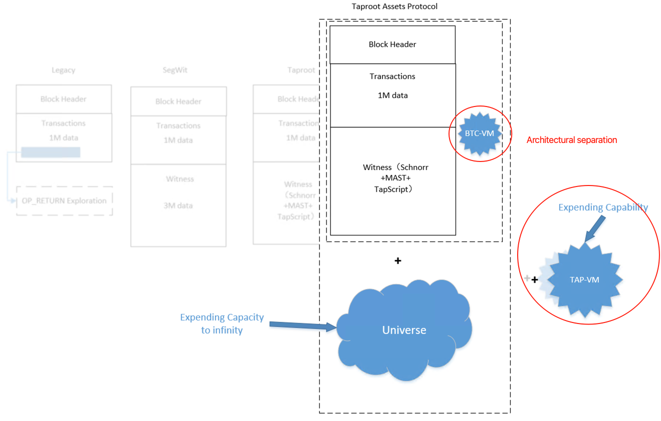 3. 使用比特币主网的共识协议。TAP 虽然在扩容与扩能上做出了很多突破,但它并不是一个独立的区块链,也不是一个独立的外部系统,它的所有变化需要使用比特币主网的共识协议,是依靠比特币主网运行的扩展部分。