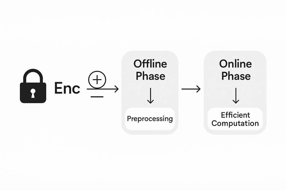 在预处理阶段,参与方利用 SHE 或相关的密码学原语,如 Oblivious Transfer (OT) 生成像 Beaver 三元组或 Oblivious Linear Evaluation (OLE) 关联随机性等所需的密码学材料。这个预处理阶段通常是计算密集但非交互式的,并且与实际输入无关。