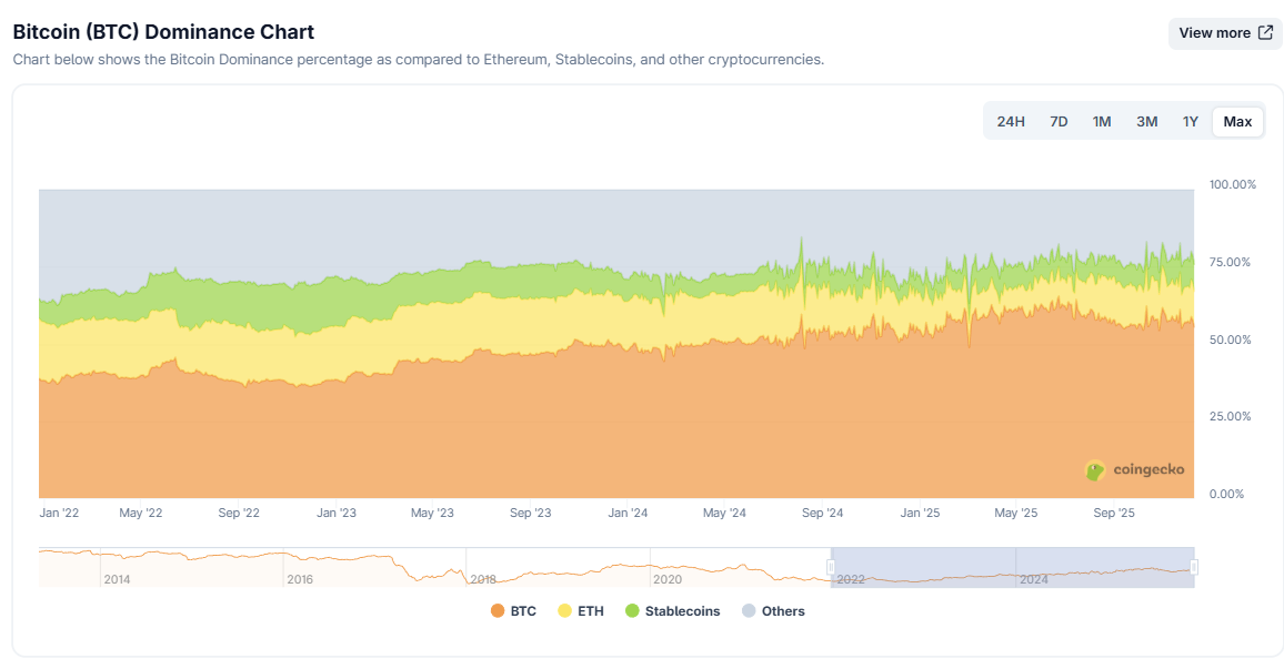 撸毛收益本质上依赖于空投代币的后续表现,而空投价值的放大往往离不开“山寨季”的东风——那段山寨币集体轮动、百倍暴涨的黄金窗口。然而整个 2025 年,加密市场陷入了持久的 BTC 独大格局,山寨币整体低迷。根据链上数据,BTC 的市值占比持续上涨,今年最高一度触及 63%。BTC 独大意味着流动性不外溢,山寨不轮动,新项目更难起势——没有价格放大器,空投价值就涨不起来,撸毛收益也就注定走弱。