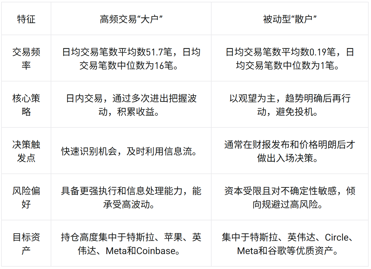 基于交易价值对用户进行划分,将交易额排名前30%的定义为“大户”,其余70%为“散户”。对他们的分析揭示了市场中最高活跃度与最低活跃度参与者之间存在的根本性行为差异。