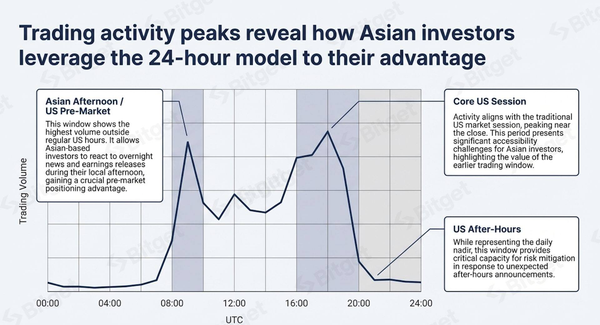 • 亚洲午后/美股盘前时段(UTC 08:00-10:00): 这是常规交易时段外最活跃的窗口。对亚洲投资者具有关键价值,因其恰逢当地下午时段,使其能及时响应隔夜新闻与财报,获取至关重要的盘前布局优势,而无需进行夜间交易。