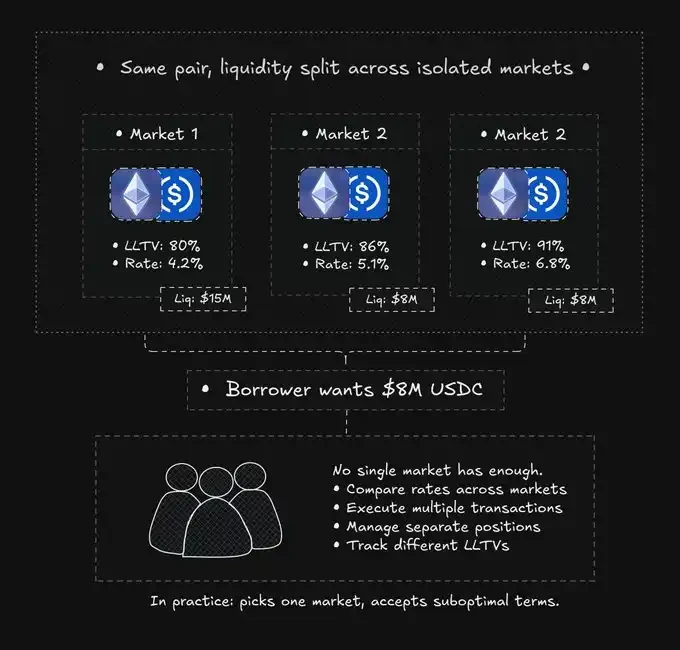 想借 800 万美元的用户无法从单一市场获得满足。他们必须手动比价、执行多笔交易、管理分散的头寸,并跟踪不同的清算阈值。理论上的最优解需要将贷款拆分到四个以上的市场中。