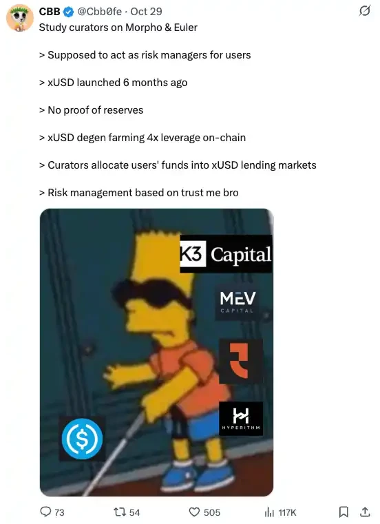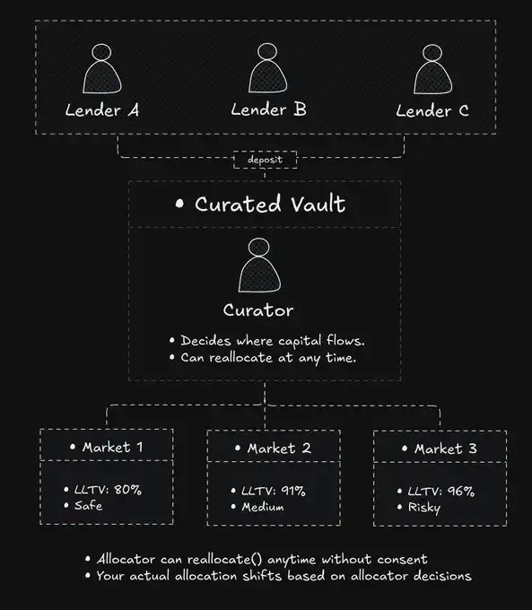 主理人决定哪些市场获得资金,且可以随时重新分配。放贷人的风险敞口会随着主理人的决策而改变,且无法预测或控制。正如某推特用户所言:「主理人是在和借款人 PvP,但借款人甚至不知道自己在被收割。」