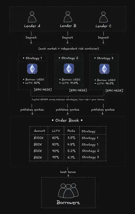 订单簿将所有策略的报价聚合成一个统一视图。借款人看到的是所有接受其抵押品的策略的综合深度。