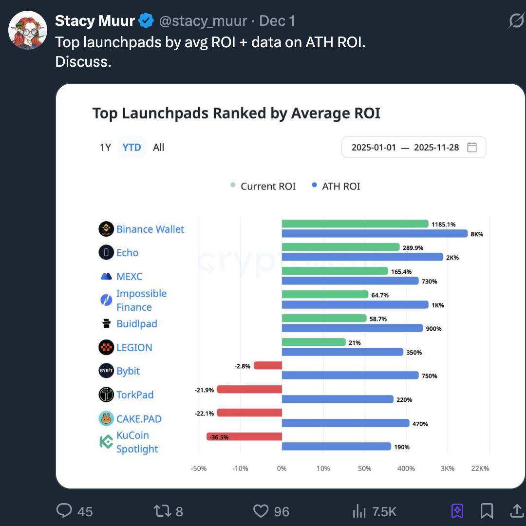 与此同时,我们注意到启动平台正在向交易所整合,这是结构性转变的一个迹象:Coinbase、Binance、OKX 和 Kraken 相关平台提供了 KYC/AML(了解你的客户/反洗钱)合规、流动性保障,以及机构可接触的精心策划的发行管道。而独立的启动平台则被迫集中到垂直领域(如游戏、迷因以及早期基础设施)。