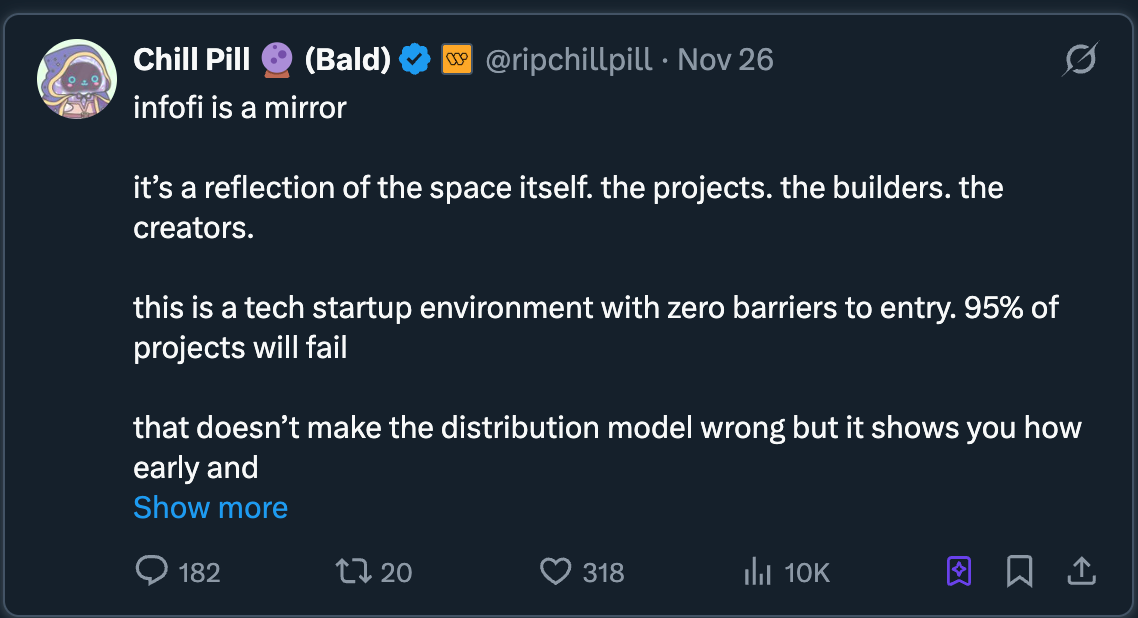 最终结论表明,InfoFi(信息金融)的第一代尝试在结构上是不稳定的。尽管核心理念——将有价值的加密信号货币化——依然具有吸引力,但激励机制需要重新设计,应以验证的贡献为定价基础,而非单纯依赖点击量。