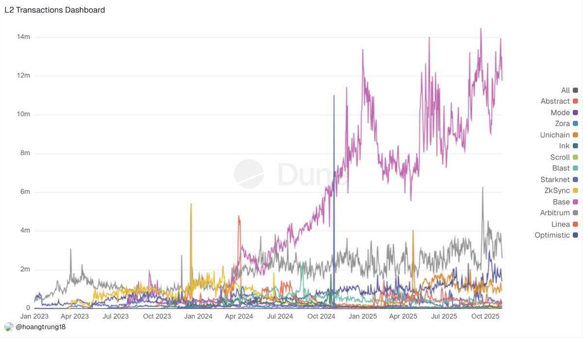 2025年,以太坊“以 Rollup 为中心”的路线图与市场现实发生了碰撞。L2Beat上曾经有数十个 L2 项目,如今演变为“赢家通吃”的局面:@arbitrum、@base 和 @Optimism 吸引了大部分新增锁仓量(TVL)和资金流动,而规模较小的 Rollup 项目在激励措施结束后,其收入和活动量下降了70%至90%。流动性、MEV 机器人和套利者追随深度和紧密的价差,强化了这一飞轮效应,使边缘链的订单流枯竭。