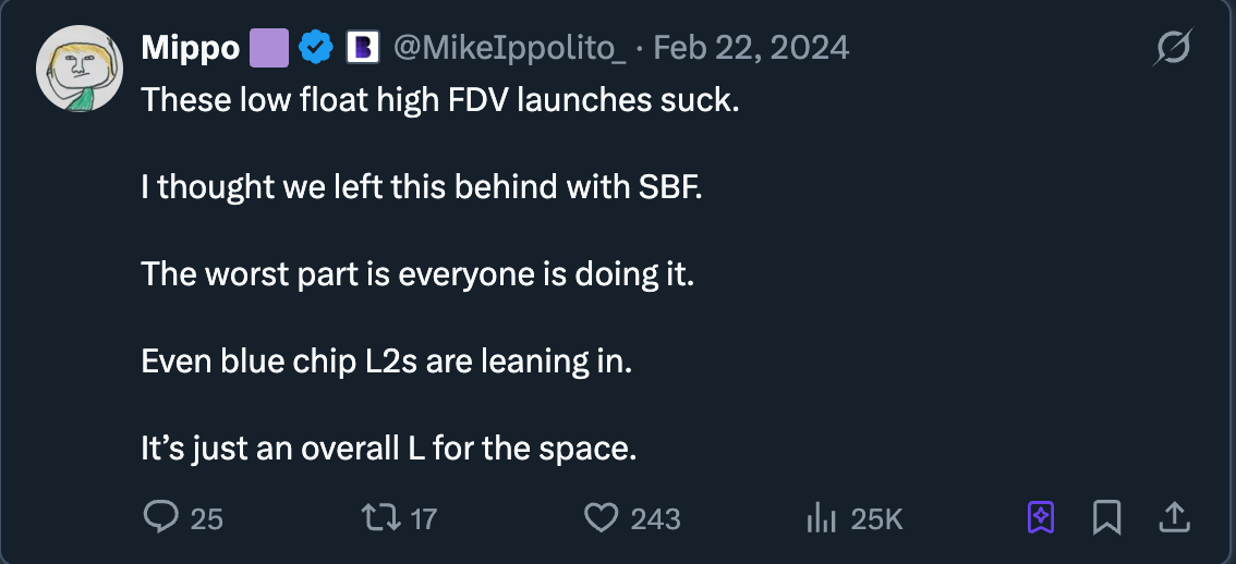 许多项目——尤其是新的L1(第一层区块链)、侧链以及“真实收益”代币——以十亿美元以上的FDV和个位数的流通供应量进入市场。