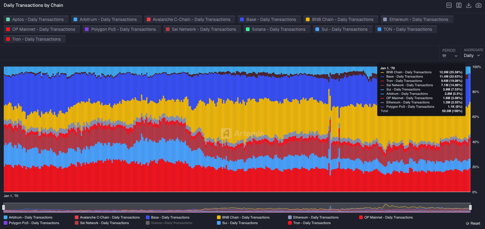 在剔除 Solana 之后,BNB Chain 在所有网络中位列每日交易量第一,展现出极强的用户活跃度(数据来源:Artemis)