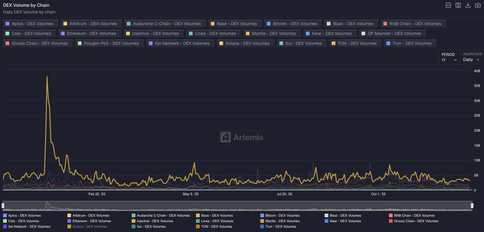 在去中心化交易所交易量方面,Solana 位居所有区块链之首,显示出其在交易型应用中的强劲吸引力(数据来源:Artemis)