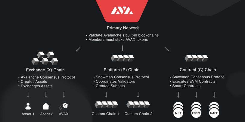 Avalanche 将资产转移、智能合约执行与 Subnet 协调分别部署在 X 链、C 链与 P 链上,使机构与企业能够构建高度定制化的应用链(数据来源:Avalanche Academy)