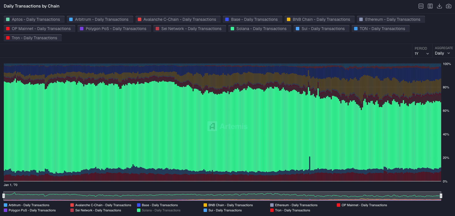 在 2025 年,Solana 在所有区块链中占据了最高的每日交易占比,约贡献了全网 55% 至 80% 的交易活动,充分体现其高频使用特征(数据来源:Artemis)