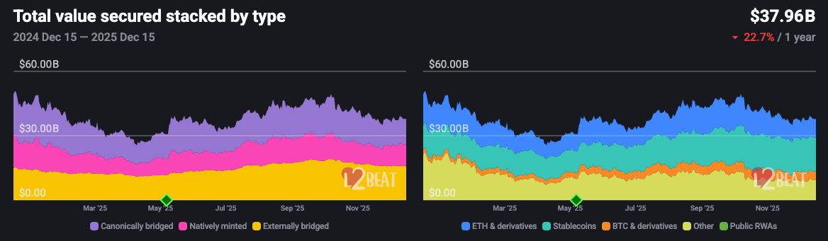 225 年,以太坊 Layer 2 网络的合计资产规模同比下降约 22%,也反映出短期内多 Rollup 并存带来的生态分散风险(数据来源:L2Beat)