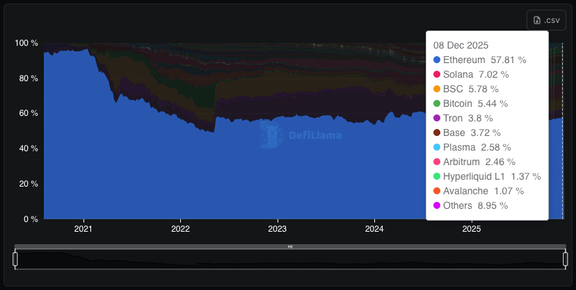 全球近 60% 的稳定币供应量运行在以太坊网络上,使其成为加密市场最重要的流动性枢纽(数据来源:DeFiLlama)