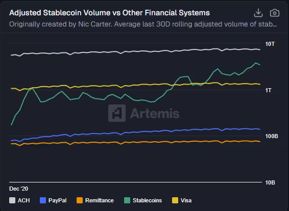 与传统支付系统相比,稳定币的流通速度显著更高。我们已经看到稳定币供应持续以 30%-40% 的年均复合增长率(CAGR)增长,交易量也随之增加。稳定币交易量已经超过了 Visa 等主要信用卡网络,目前处理的大约是自动清算所(ACH)系统交易量的一半。随着 GENIUS 法案的定义在 2026 年初敲定,我们可能会看到稳定币增长速度超越其历史平均增长率,因为现有的稳定币将继续增长,新进入者也将竞争这一不断扩大的市场份额。